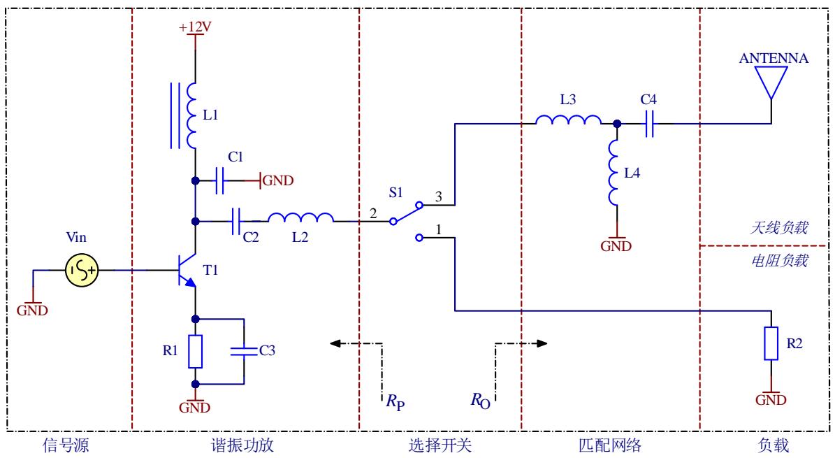 实验典型方案如图 6 所示,主要包括信号源、谐振功放、选择开关、匹配网络和负载五部分。信号源产生高频正弦信号,提供谐振功放所需的激励;谐振回路由电感 $L 2$ 和电容 $C 2$ 构成,采用并馈串联形式(也可采用串馈并联等形式);电阻 R1 和电容 C3 构成自给偏置回路,保证谐振功放工作在丙类状态;负载采用电阻或天线,通过选择开关 S1在常开或常闭之间切换。采用天线作为功放负载时,由于丙类谐振功放所要求的最佳负载阻抗 $\mathrm { \cdot } R _ { \mathrm { P } }$ 较小,而天线负载的阻抗 $R _ { 0 }$ 又很大,且含有较大的虚部分量,在功放和天线负载之间引入匹配网络,起到阻抗匹配的作用。匹配网络由电感 $L 3$ 、$L 4$ 和电容C4组成,结合表 3的分析,匹配电路推荐采用T型结构,也可尝试采用其它结构。