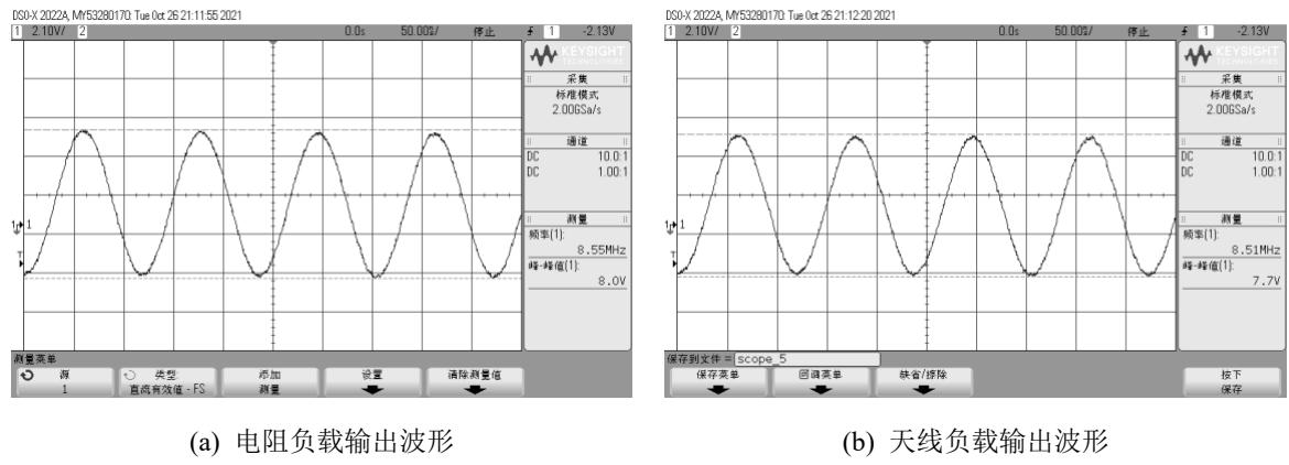 5)选择天线作为负载,调整匹配网络和功放电路工作状态,观察记录输出波形和幅值,对比分析电阻负载和天线负载的实际效果;