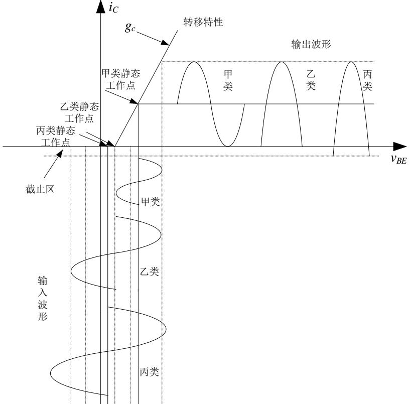 凡是采用谐振选频网络作为输出电路的放大器统称为谐振放大器。根据静态工作点的不同,谐振放大器可分为甲类谐振放大器、乙类谐振放大器、丙类谐振放大器等几种常用类型。图 1 是放大器工作在甲乙丙三种不同状态时的输入、输出波形。可以看出,三种工作状态各有优缺点。甲类放大器工作状态具有所需输入信号幅度小、输出信号不失真等优点,但工作效率较低。乙类、丙类放大器工作状态虽然工作效率较高,但是存在着输出信号失真大、所需输入信号幅度大等缺点。