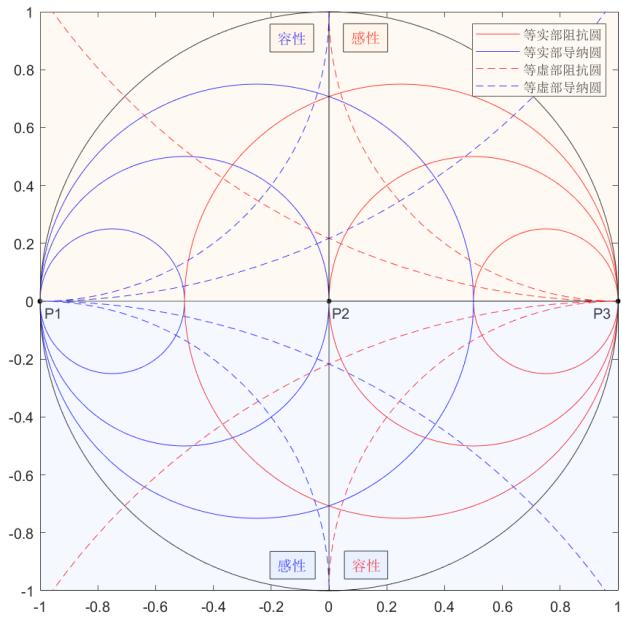 史密斯圆图是在反射系数平面上标绘有归一化输入阻抗(或导纳)等值圆簇的计算图,主要用于阻抗匹配。在史密斯圆图中,仅沿着圆周线读取并跟踪数据,就可以直接得到系统的匹配阻抗,规避了复杂的计算,使用非常方便。史密斯圆图如图 4 所示,红色实线代表等实部阻抗圆图,红色虚线代表等虚部阻抗圆图,蓝色实线代表等实部导纳圆图,蓝色虚线代表等虚部导纳圆图。负载短路时,圆退化为一个以(-1,0)为圆心、半径为 0 的点(图 1 中的 P1),此时反射系数 S11 为-1。负载开路时,圆退化为一个以(1,0)为圆心、半径为 0 的点(图1中的P3),此时反射系数 S11为1,即所有的入射波都被反射回来。负载匹配时,反射系数 S11 为 0,处于史密斯圆图的圆心(图 4中的P2),传输效率最大。