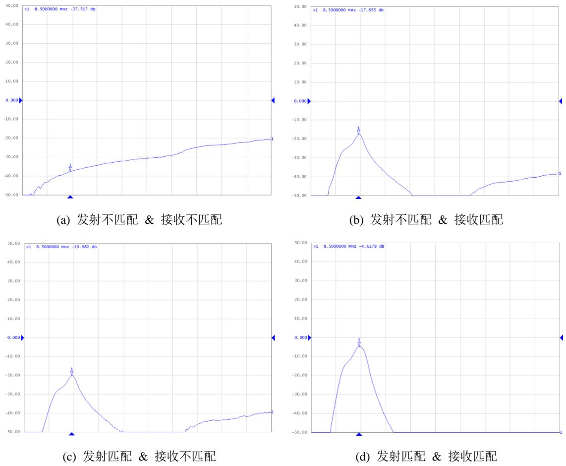 7)分别将实现匹配和未实现匹配的天线作为发射端和接收端,形成四组不同的天线发射-接收网络,测试网络的正向传输系数 S21;