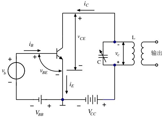 高频谐振功放原理电路如图 2 所示。 $V _ { B B }$ 、 $V _ { C C }$ 分别为基极直流偏置电压和集电极电源电压,其中直流偏置电压 $V _ { B B }$ 往往接成反向偏置形式,确保放大器处于丙类工作状态。电感??、电容??组成集电极调谐回路,对信号进行频率选择。虽然集电极电流 $i _ { C }$ 是脉冲状,但是由于选频网络的作用,谐振回路的输出几乎只含有基频分量。