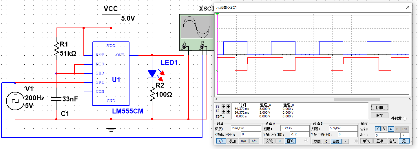 **问题2:**软件仿真与实际电路实验时,示波器测量的输出波形为周期性高低电平,但是LED不闪烁,与仿真不一致。