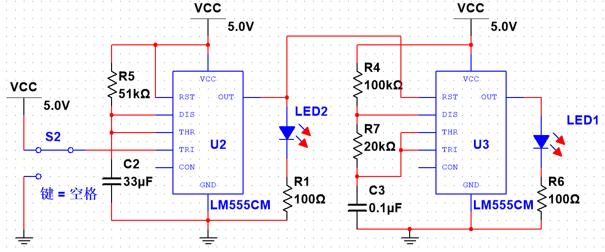 为实现自动延时控制LED灯效果,通过按键触发单稳态电路,LED灯亮一段时间后,熄灭。