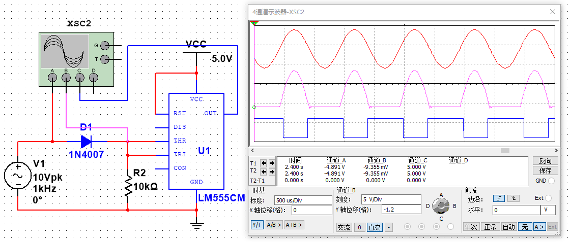 参考实验指导书电路图,由555定时器搭建施密特触发器,实现正弦波到矩形波的转换。图示的施密特电路,其正向阈值电压为$\frac{2}{3}V_{CC}$,负向阈值电压为$\frac{1}{3}V_{CC}$。