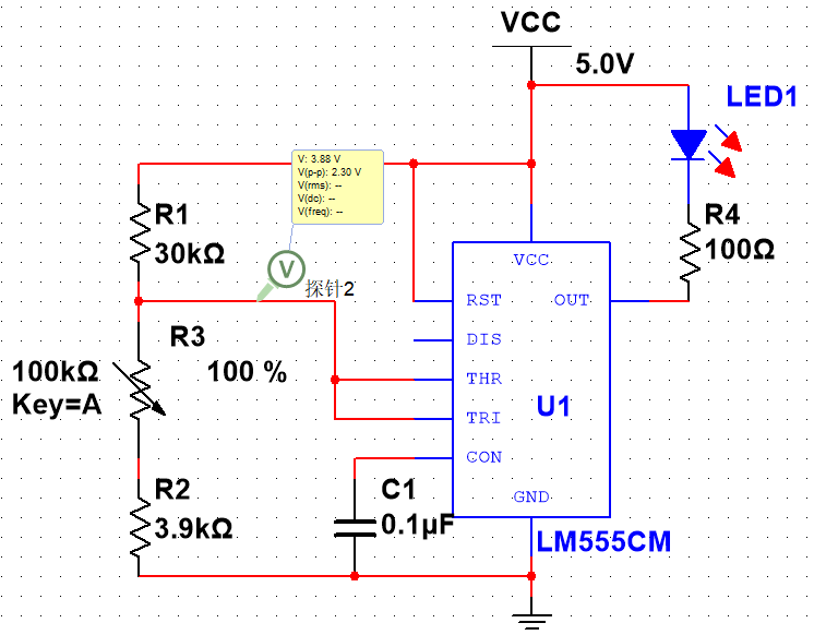 参考实验指导书电路图,由555定时器搭建多谐振荡器,实现LED灯闪烁警示。