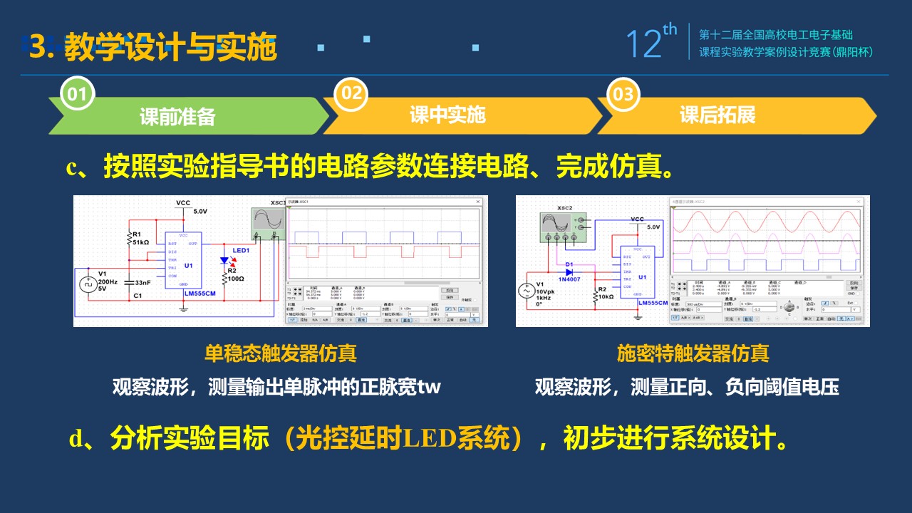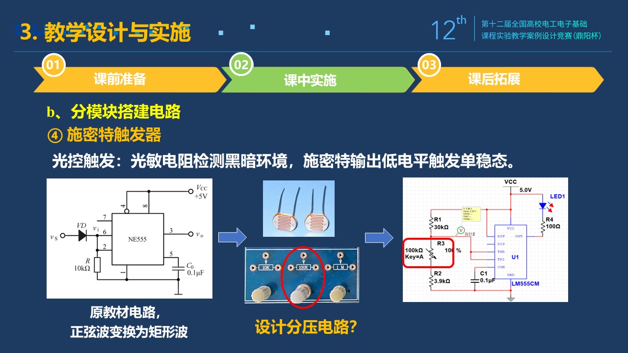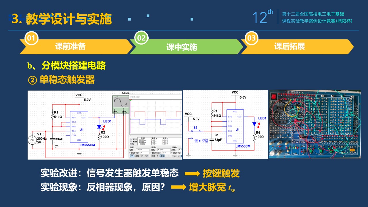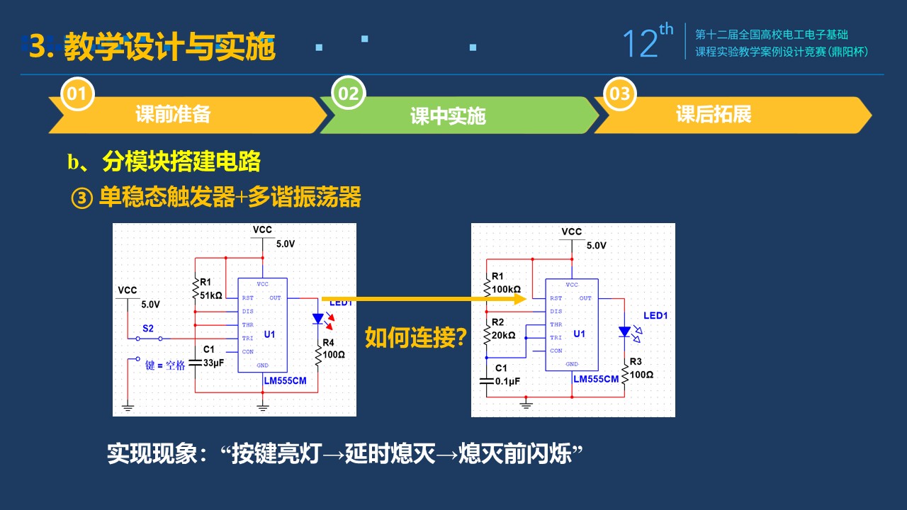 学生进入实验室后,具体实施步骤:①多谐振荡器搭建与参数调试,实现LED闪烁;②单稳态电路搭建与延时功能验证;③多谐振荡与单稳态联调,实现“按键亮灯→延时→闪烁”功能。④光控模块改进:用电位器模拟光敏电阻,设计分压电路,改进施密特触发器;⑤系统整体联调与性能优化。