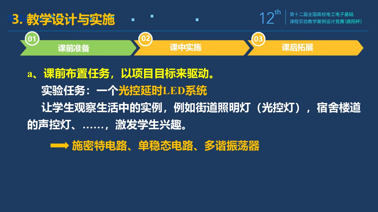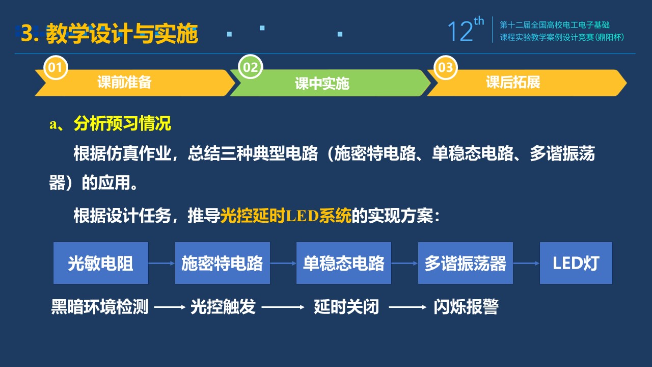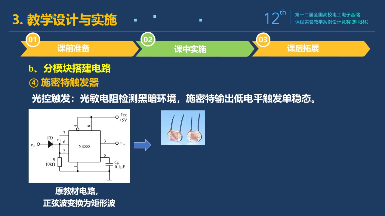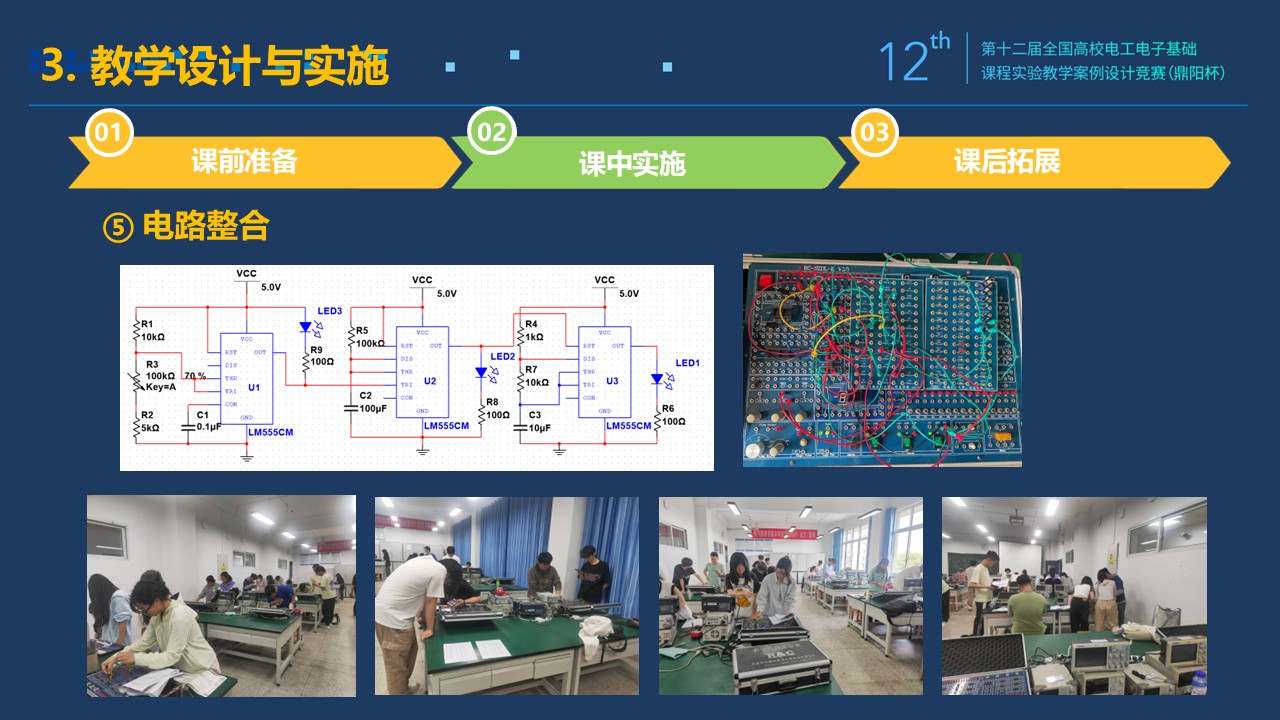 学生进入实验室后,具体实施步骤:①多谐振荡器搭建与参数调试,实现LED闪烁;②单稳态电路搭建与延时功能验证;③多谐振荡与单稳态联调,实现“按键亮灯→延时→闪烁”功能。④光控模块改进:用电位器模拟光敏电阻,设计分压电路,改进施密特触发器;⑤系统整体联调与性能优化。