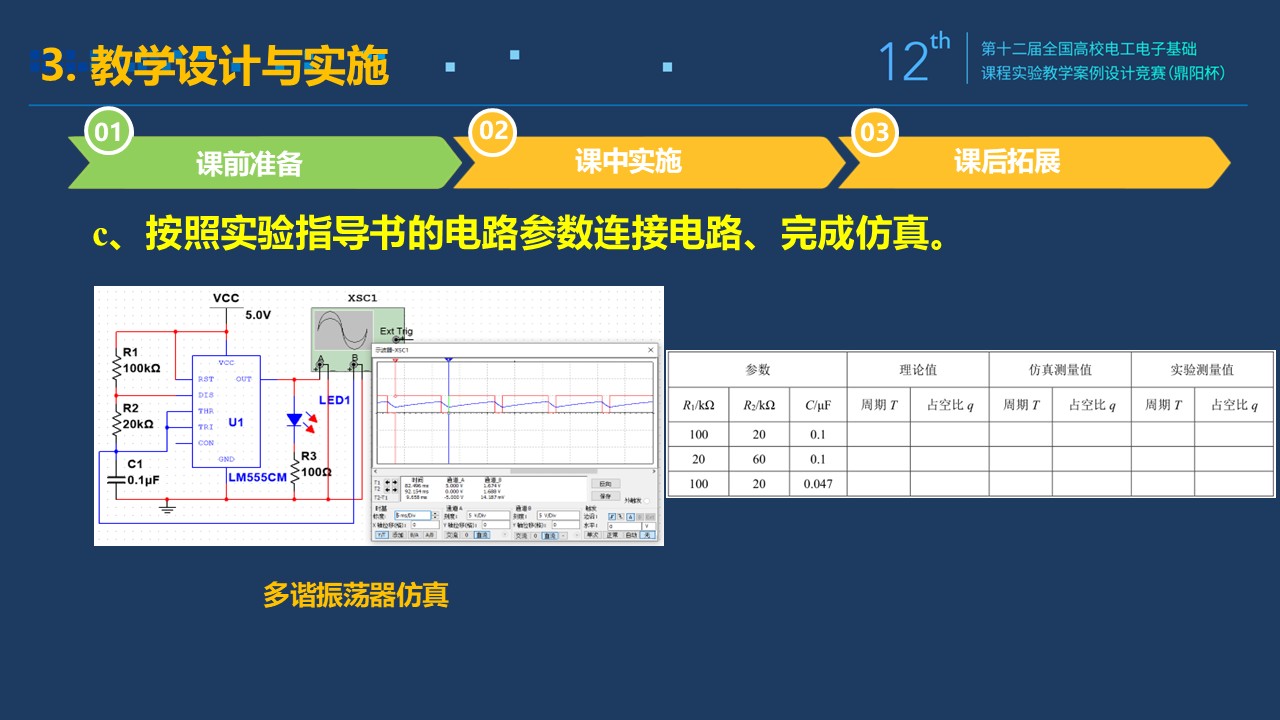 学生进入实验室前,熟悉555定时器的三种工作模式(单稳态/多谐振荡/施密特触发),并完成软件仿真。
