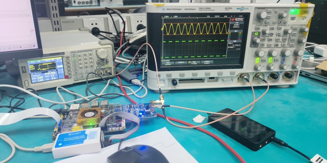 实验还有配套的FPGA板卡和对应的信号发生器及测试用的软硬件环境,如下图所示,主要用于设计基于FPGA相应功能模块的指定周期信号的生成及测试。