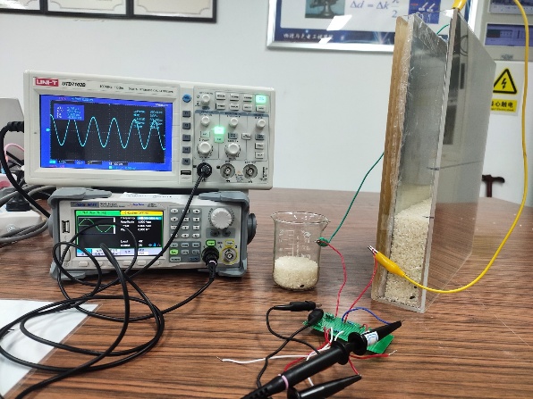 测量各支路输出电压(示波器正弦波幅值)。首先将信号工作频率调整至(2)中计算频率
