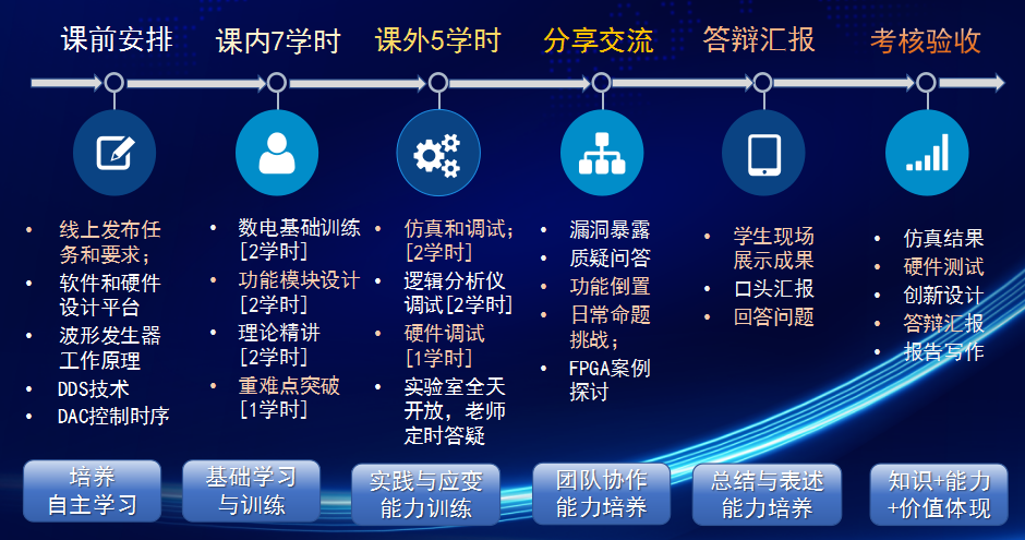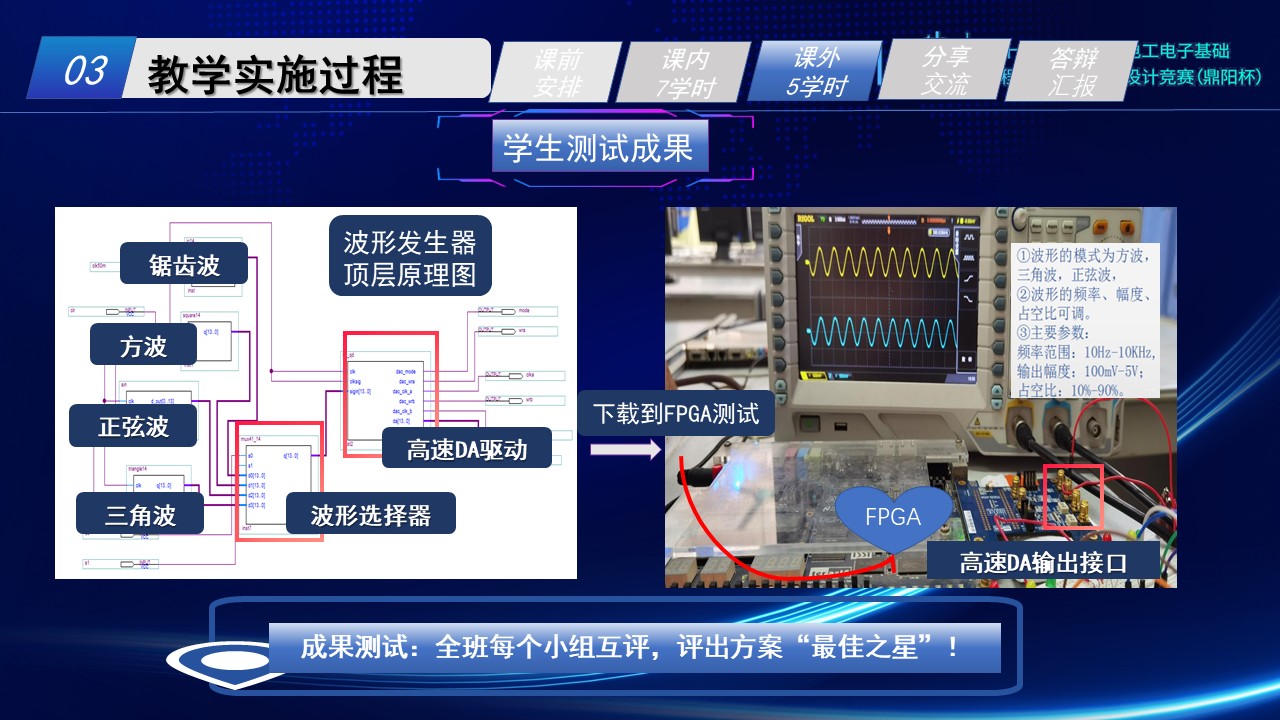 实战演练:分组实现不同波形类型,讨论互评,进行虚实融合训练和调试排故训练。用ModelSim进行虚拟仿真,用SignalTap II进行在线调试,用开发板加示波器进行硬件测试。全天开放实验室,让学生“练”起来,“调”起来,按钮调节参数,仿真软件和硬件演示波形变化,具象化DDS,使之可视可触。