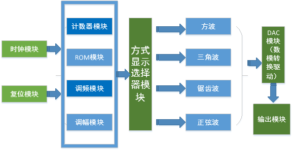 (6)各功能模块设计好后,引导学生完成各功能模块的功能验证,比如晶振要如何分频以及系统采样频率需要多少是合适的,方波、三角波、正弦波是如何编程完成的,波形仿真如何显示输出波形,如何用开关和选择器模块完成波形的切换,调频和调幅功能要如何完成等。