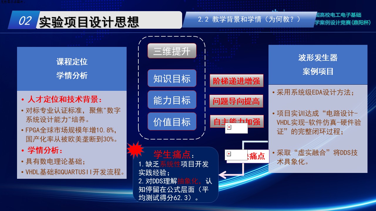 对标专业认证标准,聚焦"数字系统设计能力"培养。FPGA是现代数字系统设计的核心载体,全球市场规模年增10.8%,国产化率30%,波形发生器是通信和测控等领域的基础模块。学生已掌握VHDL基础和QUARTUSII开发流程,但缺乏系统性项目开发经验及对DDS理解抽象化。为此,采取了系统级的EDA设计方法,完整的闭环开发过程, 虚实融合的教学将DDS具象化。