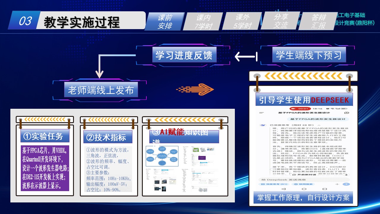 学情分析:学生经过前置课程的学习,已具有数电理论基础,并掌握了VHDL基础语法和QUARTUSII开发流程。学生薄弱点在于缺乏系统性项目开发实践经验以及对DDS理解抽象化,认知停留在公式层面(平均测试得分62.3)。
