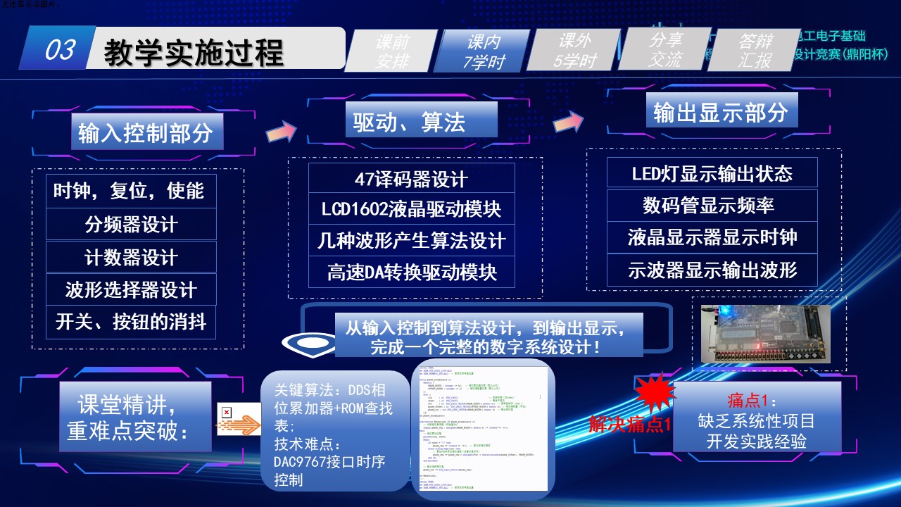 (4)课堂精讲,进行重难点突破:关键算法即DDS相位累加器+ROM查找表的原理,DAC9767接口时序控制逻辑的掌握。
