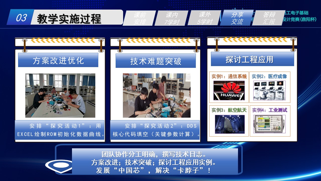 团队协作分工明确,撰写技术日志。每次讨论安排探究活动作为主题。小组团队进行方案改进优化,关键技术的探讨和突破,探讨工程应用实例等,比如FPGA在通信系统、医疗成像、航空航天、工业测试等领域的技术突破和发展,发展“中国芯”,解决“卡脖子”。