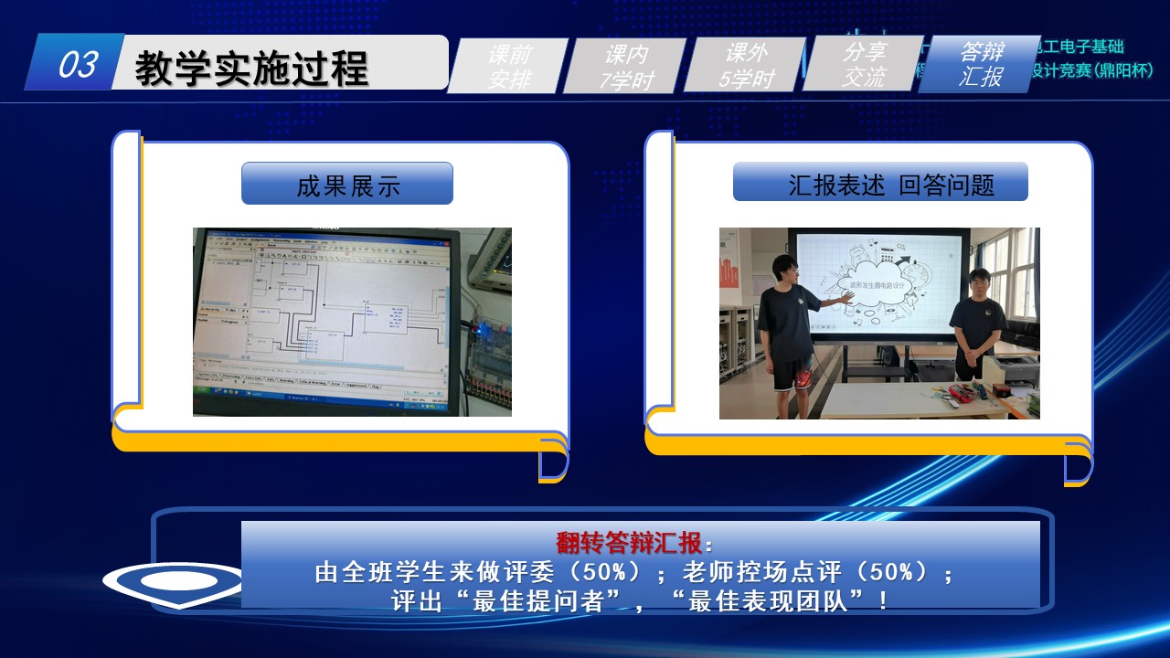 (2)教学设计翻转答辩汇报:由全班学生来做评委(50%);老师控场点评(50%);