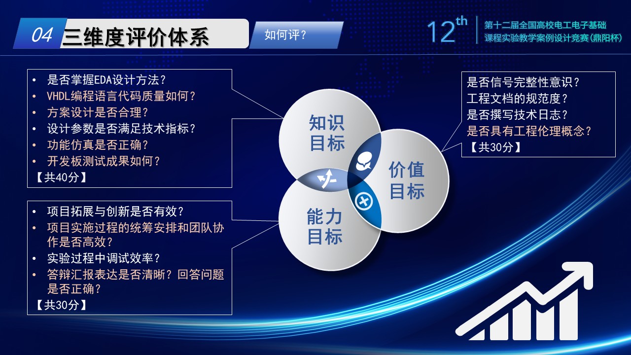 (2)能力目标:项目实施过程的统筹安排和团队协作是否高效?实验过程中调试效率?答辩汇报表达是否清晰?回答问题是否正确?(共30分)