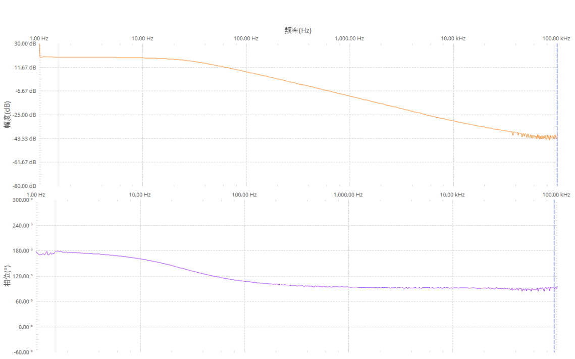 本次实验所使用的ADALM2000中网络分析仪的功能可以方便快捷地获取电路的频率响应,基于此,我们在选做实验中加上这部分内容。注意积分运算电路有低通特性,频率响应低频时是固定的值,在频率足够大时,频率响应会接近常见的积分频率特性。改变运放型号或电路元件参数,观察电路的频率响应变化。反相比例运算电路频率响应如图12所示,积分运算电路频率响应如图13所示。