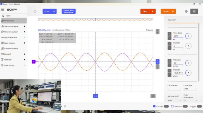 ③接线完成检查无误后,打开Scopy软件,连接虚拟信号分析仪,设置双电源模式,设置信号源为实验要求的电压信号,打开示波器观察各基本运算电路输入输出的波形、并通过电压表记录输入输出的电压值。