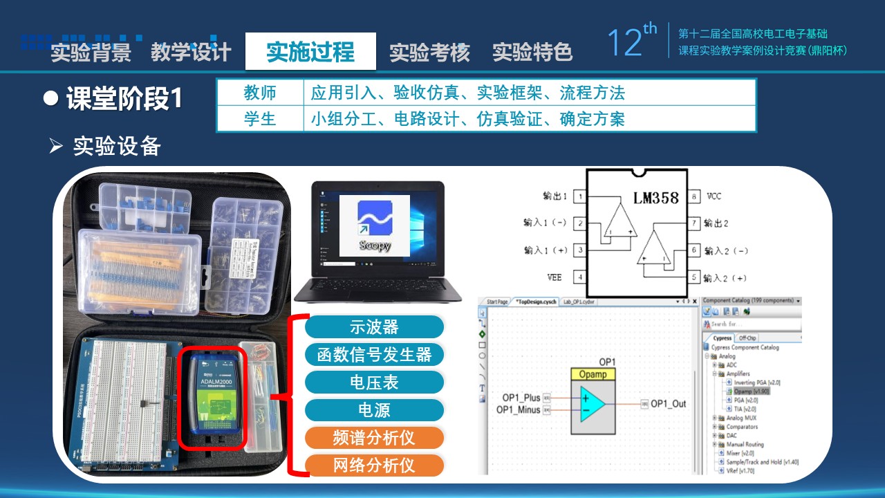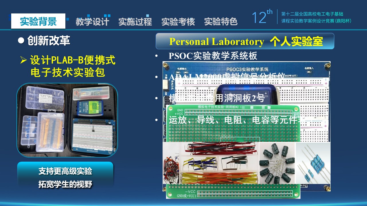 1)设计了便携式电子技术实验包,包内含有:PSOC实验教学系统板、ADALM2000虚拟信号分析仪、模电实验专用洞洞板2号、运放、导线、电阻、电容等元件若干。学生可以自由插接或焊接电路,形成完整的电路概念,深化基础理论理解,提高动手能力。新设备支持更高级的实验,可以拓宽学生的视野。