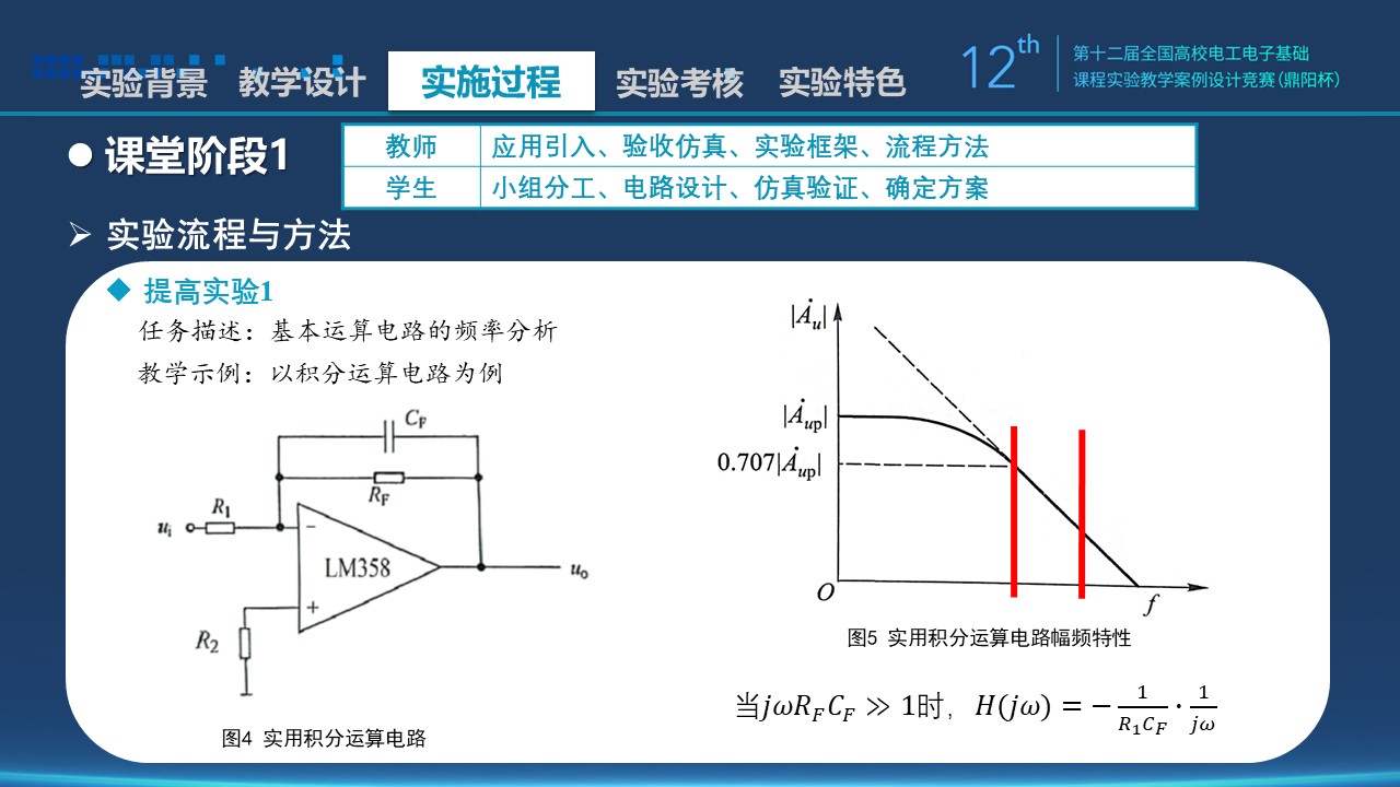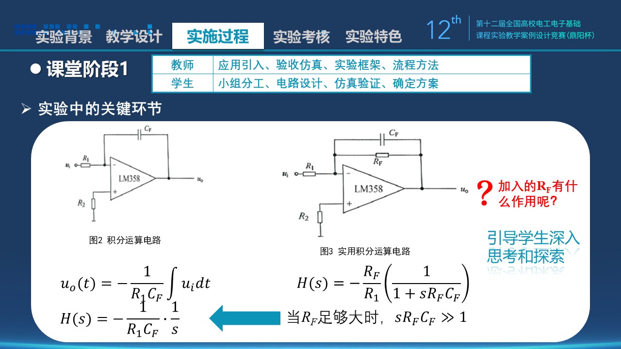 2)着重讲解积分运算电路的结构及传递函数。课本上并未就RF存在做太多解释,也没有提及RF对电路的影响,所以在实验中可以作为补充,引导学生深入思考和探究。