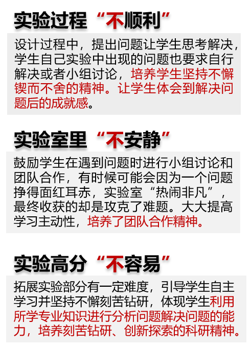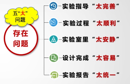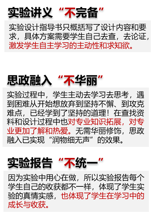 针对以前实验存在的“五太”问题如右图所示,依据ODAIC培养目标,在实验案例设计中融入“六不”元素:布置“不完善”的实验指导书,激发学生自主学习的主动性和求知欲;提出问题让学生自己解决,使得实验过程“不顺利”;鼓励学生遇到问题相互讨论,使得实验室里“不安静”,培养团队合作精神;加入拓展实验环节,使得高分“不容易”,激发学生勇于探索的科研精神;由于学生在用心实验,得到的实验体会也各不相同,所以实验报告的内容也“不统一”,体现了学生的成长与收获;实验过程中,学生主动去学习去思考,遇到困难从开始想放弃到坚持不懈、到攻克难点,已经学到了坚持的道理!在查找资料和设计过程中也对专业知识拓展,对专业更加了解和热爱。思政融入虽“不华丽”但已实现“润物细无声”的效果。创新点总结如图12.2所示。